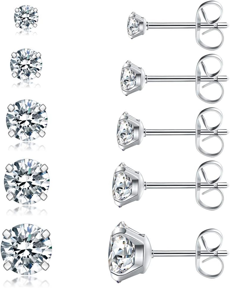 5 Pairs Stud Earrings Set, Hypoallergenic Cubic Zirconia 316L Earrings Stainless Steel CZ Earrings 3-8mm (Steel color)